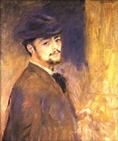 Pierre-Auguste Renoir was an impressionistic painter of 'real life', which included brilliant color and light. Later in his life, his paintings became more disciplined and formal, involving more portraits of women. Renoir began as a painter in a porcelain factory at the age of 14 in Paris, where he learned the impressionistic style and the importance of craftmanship. He enjoyed light-hearted themes, many of which were done while in Louvre. He befriended other artists while there, including Claude Monet (1840-1926), Alfred Sisley (1839-1899) and Frederic Bazille (1841-1870). Renoir's classic impressionistic style is seen mainly in his early works- primarily the paintings he had done at a place called La Grenouillere. It wasn't until the 1870's that he became an artist without financial worries, thanks to an art dealer by the name of Paul Durand-Ruel, who purchased his paintings on a regular basis. He once told Durand-Ruel- "I want to paint stunning pictures that you can sell for very high prices". While Renoir moved away from the impressionistic style of painting during a visit to Italy in 1881, one of his paintings, entitled, 'The Umbrellas', is seen as a beginning of that change. It has been said that the painting reflects two styles- it began with impressionism and was finished with crisper, cleaner strokes.